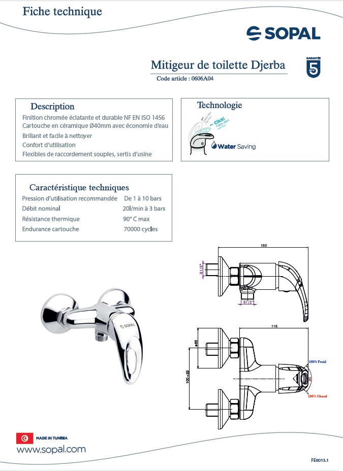 Garantie SOPAL accorde toute l’attention requise dans la fabrication de ses produits et s’engage à garantir sa robinetterie durant cinq ans à partir de la date d’achat.