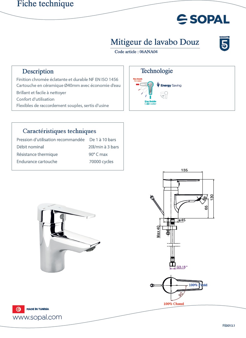 Garantie SOPAL accorde toute l’attention requise dans la fabrication de ses produits et s’engage à garantir sa robinetterie durant cinq ans à partir de la date d’achat.