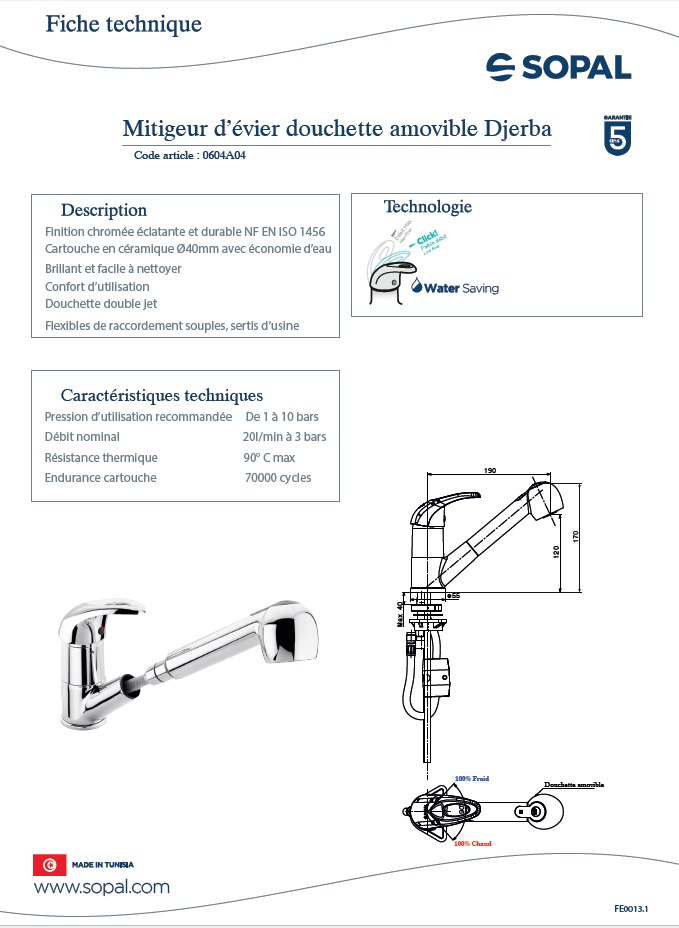Garantie SOPAL accorde toute l’attention requise dans la fabrication de ses produits et s’engage à garantir sa robinetterie durant cinq ans à partir de la date d’achat.