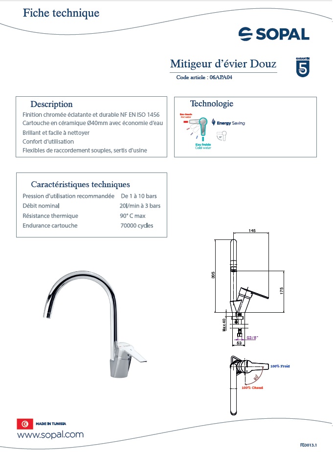 Garantie SOPAL accorde toute l’attention requise dans la fabrication de ses produits et s’engage à garantir sa robinetterie durant cinq ans à partir de la date d’achat.